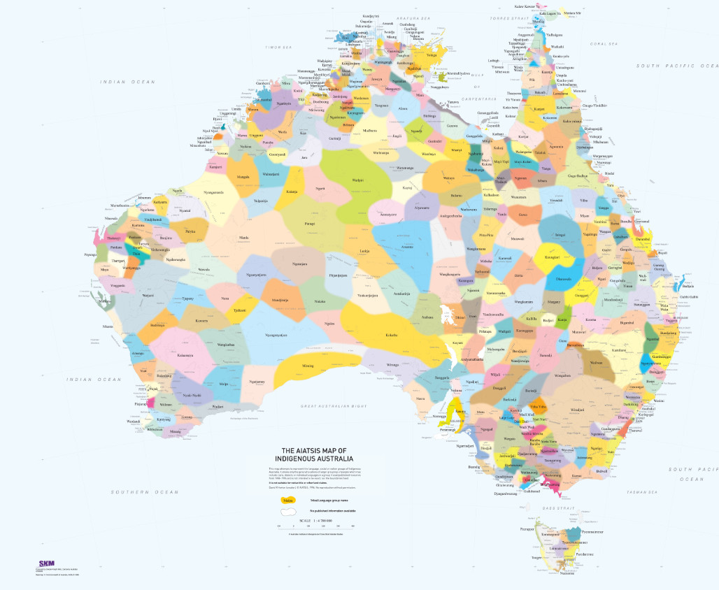 This map attempts to represent the language, social or nation groups of Aboriginal Australia. It shows only the general locations of larger groupings of people which may include clans, dialects or individual languages in a group. It used published resources from 1988-1994 and is not intended to be exact, nor the boundaries fixed. It is not suitable for native title or other land claims. David R Horton (creator), © Aboriginal Studies Press, AIATSIS, and Auslig/Sinclair, Knight, Merz, 1996. No reproduction without permission. To purchase a print version visit: https://shop.aiatsis.gov.au/
