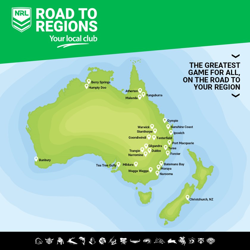 As part of the NRL’s commitment to the heartlands of our game, the 2024 NRL Road To Regions presented by Your local club will see former and current NRL and NRLW stars take part in a broad range of community visits throughout February and March, across Australia and New Zealand!
