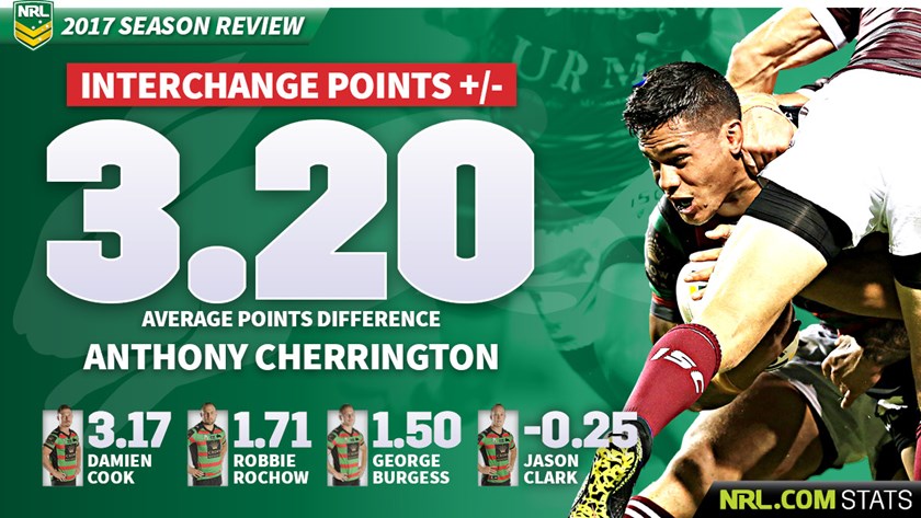 South Sydney’s unhappy season was reflected in having nobody in the top 16 in this category. Anthony Cherrington, who played just five matches, and Damien Cook led the way with modest totals.