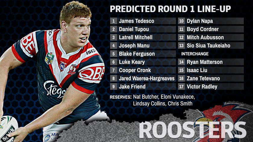 1 James Tedesco, 2 Daniel Tupou, 3 Latrell Mitchell, 4 Joseph Manu, 5 Blake Ferguson, 6 Luke Keary, 7 Cooper Cronk, 8 Jared Waerea-Hargreaves, 9 Jake Friend, 10 Dylan Napa, 11 Boyd Cordner, 12 Mitch Aubusson, 13 Sio Siua Taukeiaho. Interchange: 14 Ryan Matterson, 15 Isaac Liu, 16 Zane Tetevano, 17 Victor Radley. Reserves: 18 Nat Butcher, 19 Eloni Vunakece, 20 Lindsay Collins, 21 Chris Smith.