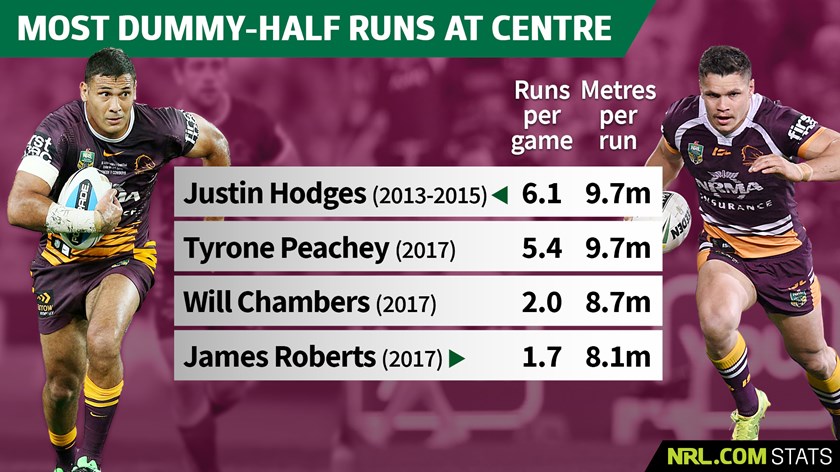 Roberts had the second most dummy half runs at Brisbane in 2017 after Andrew McCullough with 44 runs in 26 games at 1.7 per game and 8.1 metres per run.