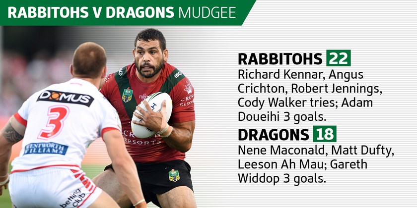 Rookie Dragons fullback Matt Dufty again showed his speed when he got on the outside of teenage Rabbitohs halfback Adam Doueihi to score in the 18th minute but momentum shifted after the break.