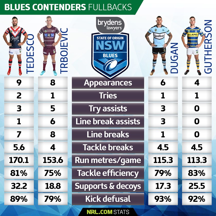 Realistically this is a two-horse race between incumbent James Tedesco and rising star Tom Trbojevic. Dugan has done the job well in the past but is currently racing to get back on the field from a broken foot in time to challenge for a centre spot and while newly minted Eels skipper Clint Gutherson shapes as a Blues bolter his best hope for an unlikely Origin debut this year appears the bench utility role.