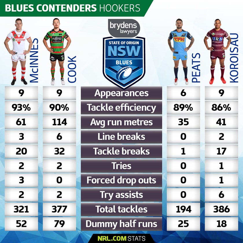 McInnes is playing in an in-form team that is likely to have the largest NSW representation of any club and is statistically the most reliable defender. Cook's running game, statistically, is peerless among all dummy-halves this year with a whopping 114 metres, six line breaks and 32 busts.
