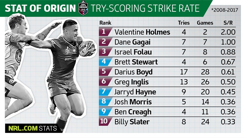 Try-scoring sensation Valentine Holmes actually boasts easily the best strike rate of the past 10 years with four tries in just two Holden State of Origin games for what will surely prove to be an unsustainable strike rate of two tries per game.