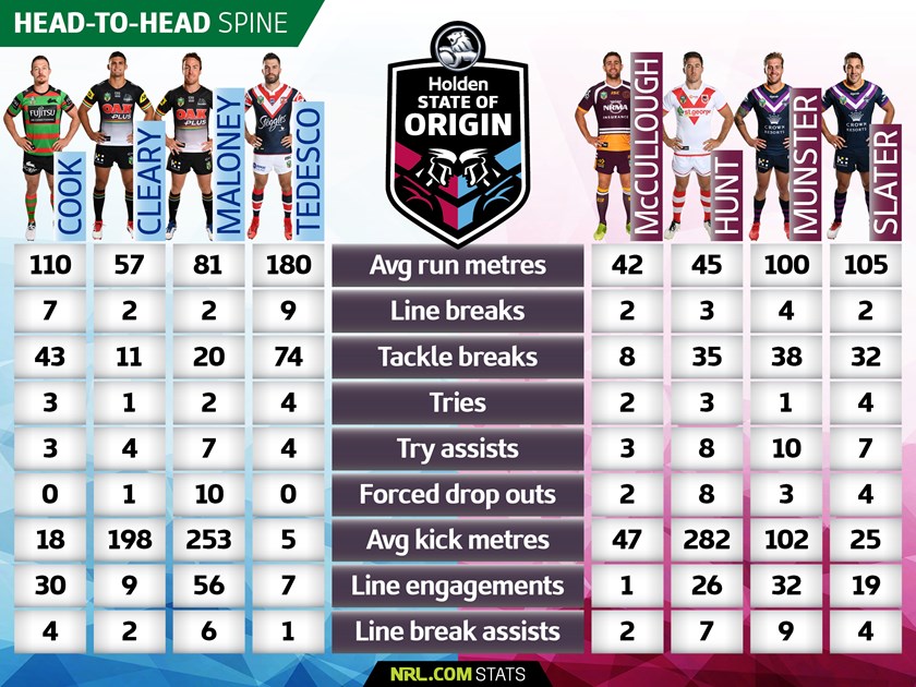 The overall running game also favours NSW due to the huge disparity between Cook (seven line breaks and 43 busts) over McCullough (two breaks and eight busts) as well as between fullbacks (Tedesco's 74 busts more than double Slater's 32 while his 180 average run metres laps Slater's 105 per week). The halfbacks both have impressive running games with similar figures while Munster (100 metres, 38 busts) is the only Maroon who edges his opposite with Maloney (81 metres, 20 busts) nevertheless holding his own.