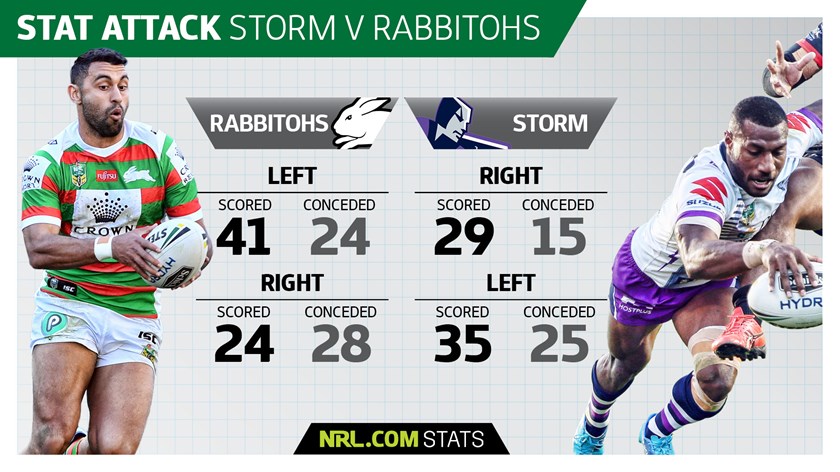 Melbourne have conceded just 15 tries in 19 games on their right side (where Souths' left edge will match up) while the Storm's left side has leaked 25 tries.