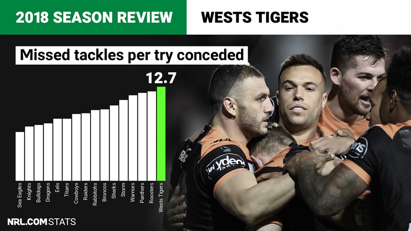 The Tigers missed plenty of tackles in 2018 – their 956 at almost 40 per game was comfortably an NRL high – but their steady defensive record means those missed tackles were easily the least expensive of any team. The club averaged one try conceded for every 12.7 tackles missed, highlighting how well they covered for missed tackles. At the other end of the scale, Manly conceded a try for every 6.9 missed tackles.