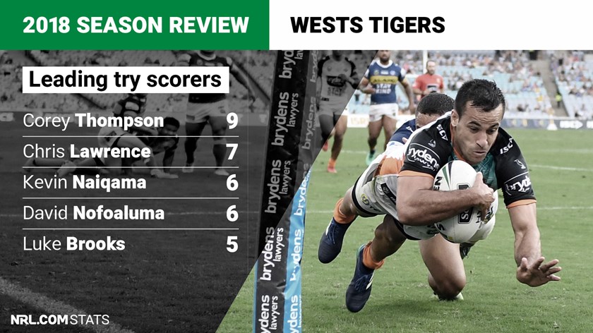 Unsurprisingly, given they scored the fewest tries in the NRL, the club had no individuals crack double figures in 2018. Impressive recruit Corey Thompson was the best, with nine tries in 20 games across fullback and wing. Veteran second-rower Chris Lawrence crossed for seven while outside backs Ken Naiqama and David Nofoaluma managed six each.
