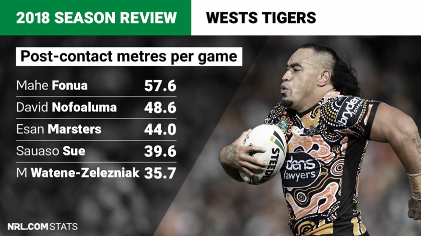 The Tigers were among the less-effective teams at punching through contact with the ball, finish 13th for post-contact metres. Their best performer was bustling centre Mahe Fonua, whose per-game average of 57.6 post-contact metres was fifth-best across the NRL. Sauaso Sue's 4.18 post-contact metres per-carry was seventh best across all players in the NRL. Off the ball, the Tigers conceded the equal-most post-contact metres per game with 525.
