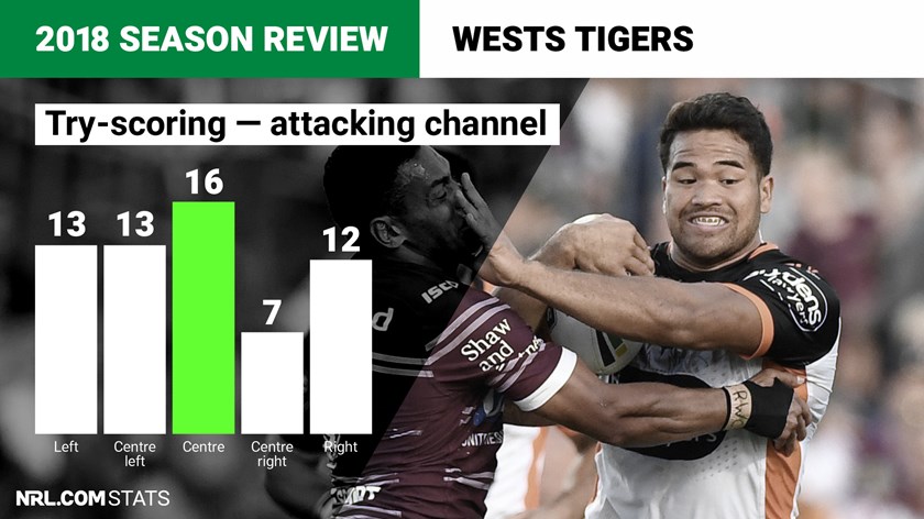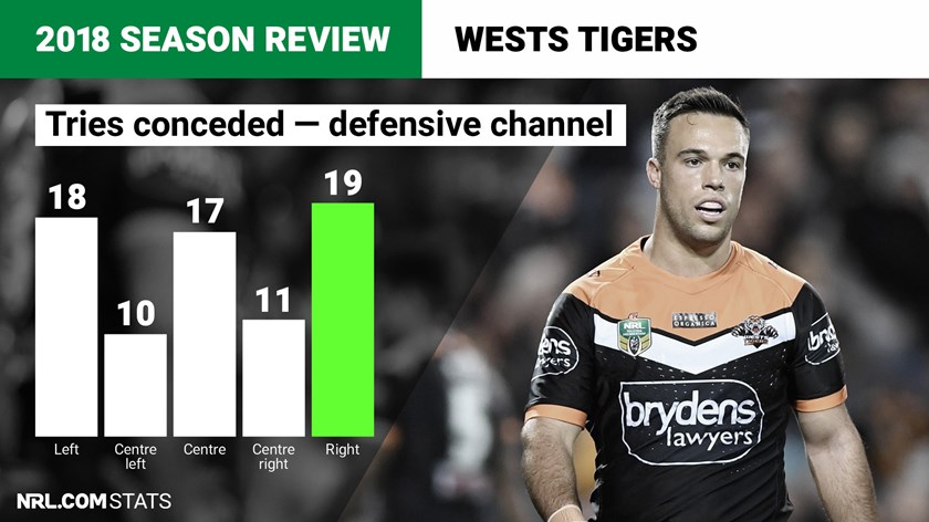 The Tigers mostly defended fairly well in 2018 which is an encouraging platform heading into next season. Like most clubs a fair proportion of tries conceded came on the flanks, with 18 on the left wing and 19 conceded on the right wing.