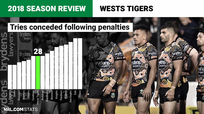The Tigers were just inside the top half of the competition when it comes to tries conceded from penalties, with 28. Five clubs performed better with the Dragons and Storm at just 21, while the Eels and Titans fared worst with 42 each. The club's most-penalised players – Luke Brooks and Elijah Taylor (20 each in 2018) – were both equal 16th on the list ofmost-penalised players. The Tigers had six sin-binnings which is again in the top half of the competition but they did pay a price for it, averaging 3.3 points worse off than their opponents during sin-bin periods – the fourth-worst in the NRL.