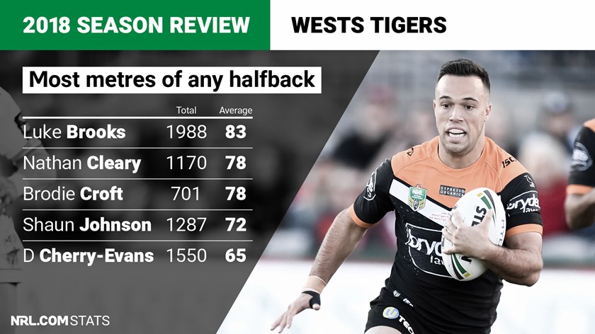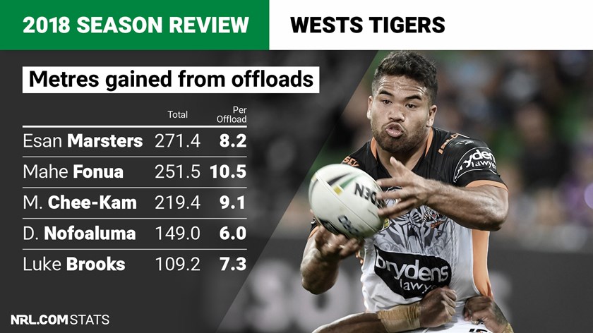 The Tigers were right in the middle of the pack for offloads in 2018 with their 268 placing them seventh. Esan Marsters (54) and David Nofoaluma (33) led the way. The club was third best in the NRL in terms of most metres gained per game from offloads, with 74.9. Marsters (271 metres for the season), Nofoaluma (251 metres) and Michael Chee Kam (219 metres) gained the most total metres for the club from offloads.