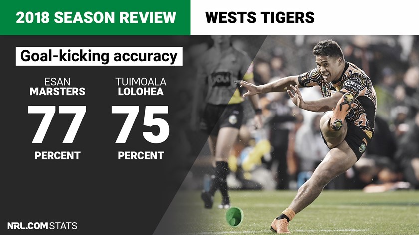 The Tigers finished with a 75.6% goal-kicking success rate with 65 goals from 86 attempts, placing them ninth in the NRL (Bulldogs at 86.5% were top). Marsters was the main kicker with 56 from 73 at 76.7%. The only other attempts were by Tui Lolohea, who had nine from 12 at 75%.