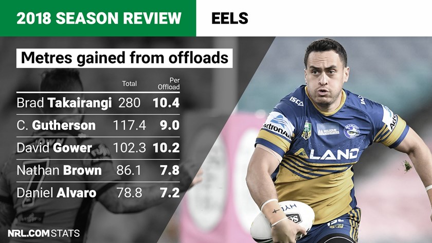 Parramatta placed 13th for total metres gained from offloads in 2018. Their 214 total offloads ranked 13th while their 8.5 average metres gained from the carry following an offload was also in the bottom half of the competition. Their top offloader was Brad Takairangi with 38; Clint Gutherson and Manu Ma'u were next with 17 apiece.