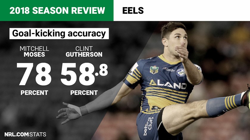 The Eels managed just under a 70% success rate converting tries, plus nine of 10 penalty goals kicked for an overall average of 72.4%, placing them second-last in the NRL. Back-up kicker Clint Gutherson kicked under 60% in 2018 while regular kicker Mitch Moses managed 78%. Their tally of 55 two-pointers was five behind Newcastle's 60 goals which was the second lowest.