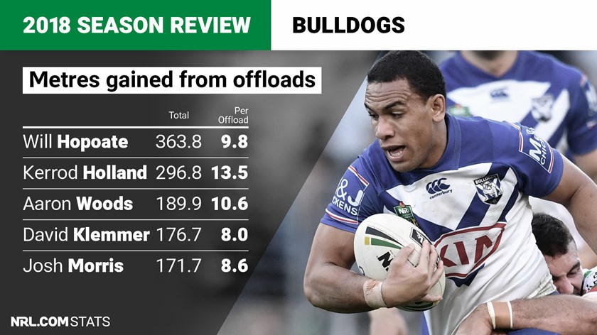 The Bulldogs made more metres from offloads than any other club in 2018, gaining almost an extra 80 metres per game. Will Hopoate – who popped a ridiculous 10 offloads in a single game against the Rabbitohs – was most responsible, with his offloads garnering an extra 364 metres through the season. Holland (297), Woods (190) and Klemmer (177) were next best.
