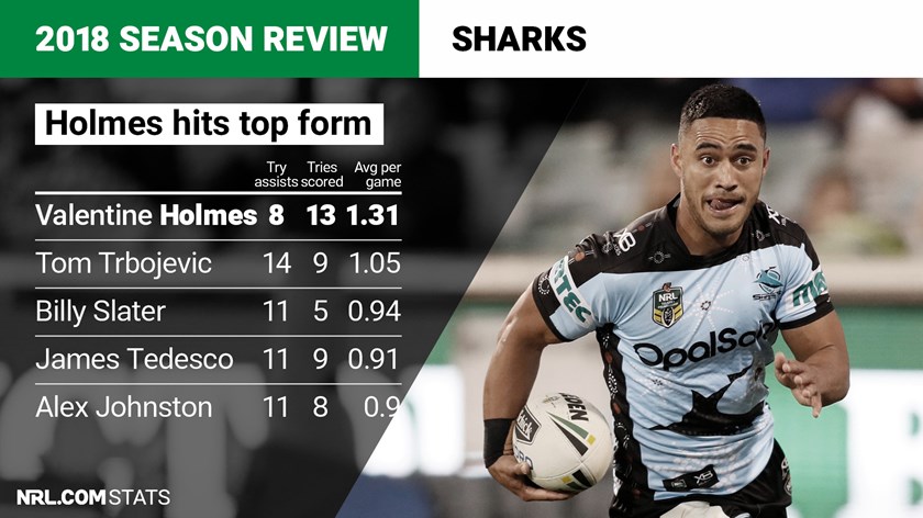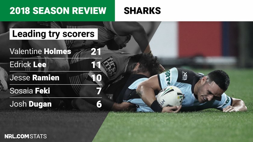 In a stunning season from fullback Val Holmes, he racked up 21 tries through the regular season, just one behind competition leader David Fusitu'a. While some clubs had no players crack double figures for tries, the Sharks had three with Edrick Lee (11) and Jesse Ramien (10) also enjoying profitable seasons. None of that trio with be with Cronulla in 2019.
