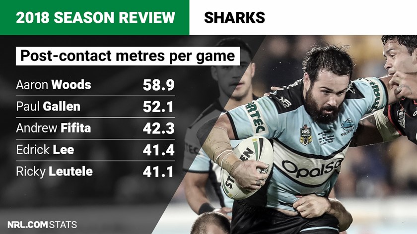 It is actually mid-season recruit Aaron Woods who was the king of post-contact in the Sutherland Shire, with 58.9 per game (this goes down to 54.7 for the season factoring in his games for Canterbury but still leaves him as the only Shark in the NRL top 10). Paul Gallen (52.1) was next best with Fifita back in third on 42.3 per game.