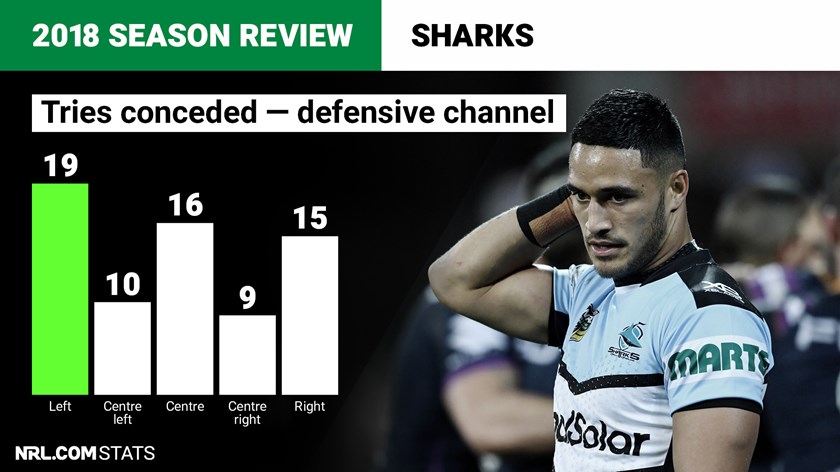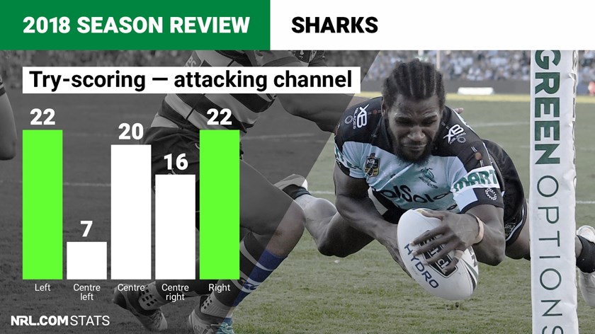 The Sharks dominated on the flanks and it didn't much matter which one, with 22 tries scored on both the left wing and the right. Only the Rabbitohs, Raiders, Roosters and Warriors had more success on the fringes. The Sharks also managed 20 right through the middle of the field.
