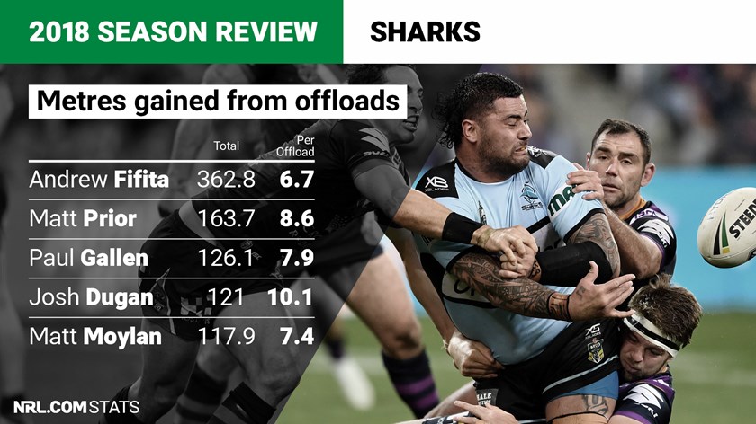 Andrew Fifita was the league's second most prolific offloader with 70 behind Manly prop Martin Taupau (71), but the Sharks had no one else in the NRL top 35 for most offloads. Matt Prior (23), Paul Gallen and Matt Moylan (both 22) were next.