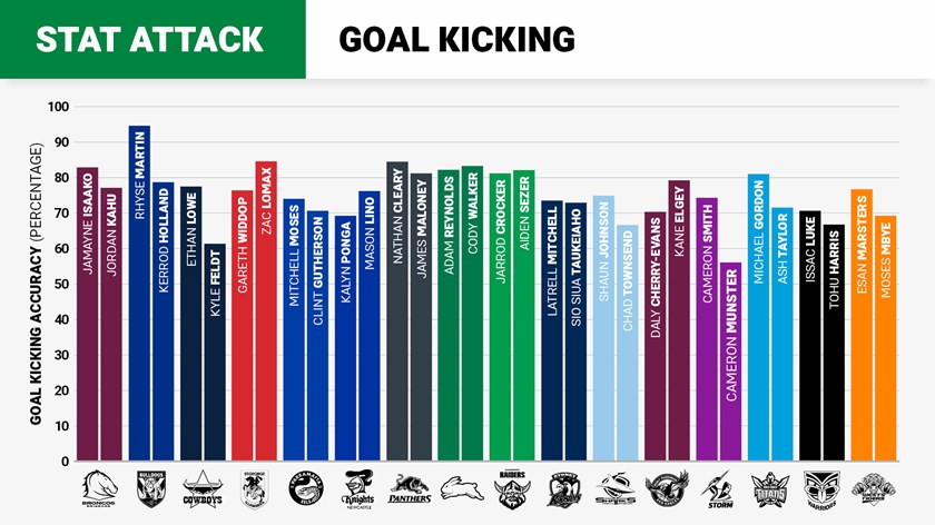 The Warriors are the biggest losers in the goal-kicking department following the exits of Shaun Johnson and Mason Lino. Only Issac Luke, who kicks at 70.6% and is no certainty to play in round one, is the club's most recognised option. Tohu Harris kicked eight goals over four seasons at Melbourne and may be club's first string option in the opening round. Potential halfback Chanel Harris-Tavita kicked at 65% in the Intrust Super Premiership throughout the 2018 season but is untested at NRL level.