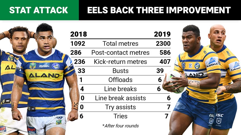It's not just the yardage either. Gutherson's ball-playing has been crucial, as has Ferguson's second-phase play. The difference in the Parramatta back three from last year to this year through four rounds includes an increase in tackle busts from 33 to 39, in offloads from one to six, in line breaks from four to six, in line break assists from zero to six and in try assists from zero to seven.