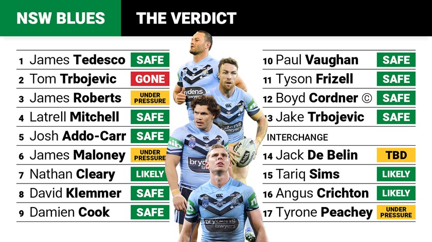 In limited game time for Manly this year, Trbojevic has been in red-hot form and as one of the Blues' best in 2018 was an absolute certainty to be retained. However a second hamstring strain now appears to have ended his hopes of featuring in game one but he could still press for a role later in the series.