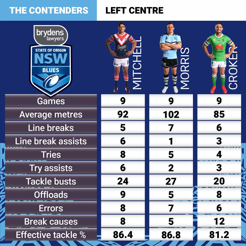 Josh Morris is playing left centre for the Sharks but spent most of his 14-game Origin career at right centre and is starting to shape up as a genuine chance of being recalled in that spot given his own strong recent form and the spate of injuries. A renowned defensive centre, his numbers off the ball stack up very favourably against all the other candidates but his attacking numbers are just as impressive with 27 busts, seven line breaks and five tries this year.