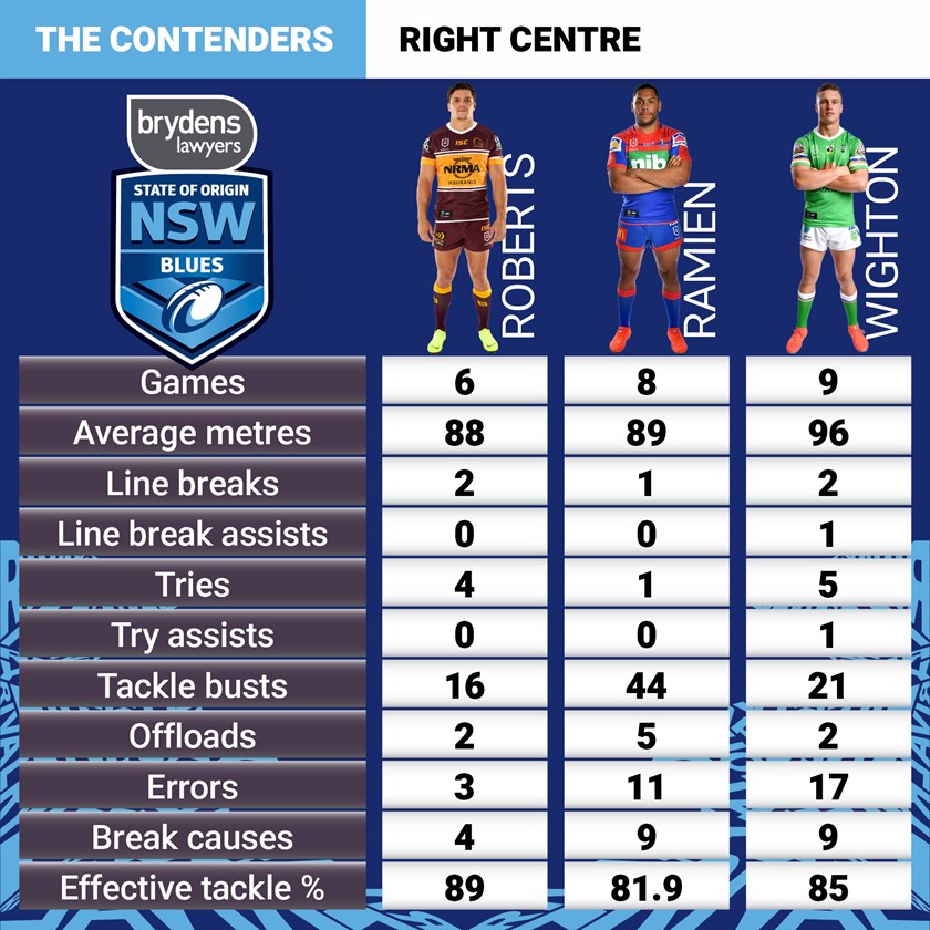 With James Roberts down on form and not in the Broncos' Telstra Premiership line-up, it looks likely the Blues will be making a change at right centre unless "The Jet" can show something over the next two games. Jack Bird was shortening dramatically before his injury while Joey Leilua also had claims before his neck surgery. While players like Kotoni Staggs, Zac Lomax and Bronson Xerri look like options for 2020 and beyond, experience will probably exclude them this year.