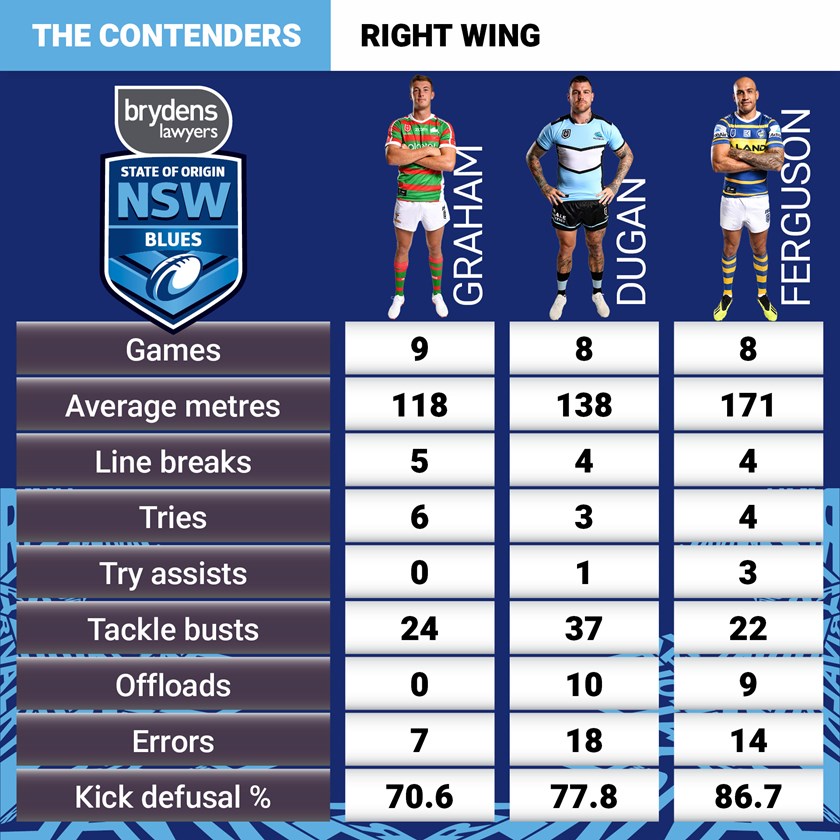 Looking at form and stats, there is no question Eels recruit Blake Ferguson is streets ahead of the other options. He's making the most metres, has been impeccable under the high ball and has been scoring and setting up tries. Beyond that he looks as settled as he has ever been while teammates rave about his attitude and leadership. The question is whether he will be looked at after misdemeanours in previous camps and a failure to attend a 2019 pre-season get-together organised by coach Brad Fittler. There is also a question of whether it is time to look more forwards than backwards.