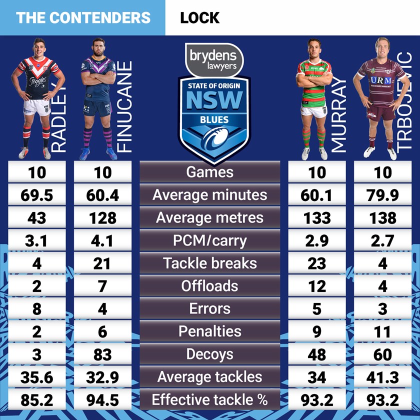 Radley has been playing hooker for the Roosters in the absence of Jake Friend, resulting in his running stats looking far leaner than the others. It does give him a utility advantage if Fittler opts to go without an all-round utility like Tyrone Peachey or Cody Walker on the bench but at this stage he looks to be a better chance in that kind of role with three other forwards on the bench.