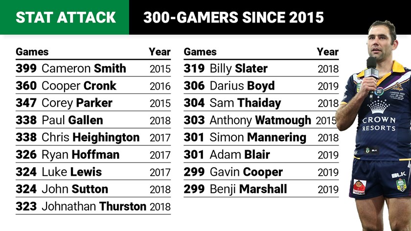 While it has taken 112 seasons since the first premiership match between South Sydney and North Sydney at Birchgrove Oval in 1908 for anyone to play 400 matches, almost as many players have become members of the 300-game club in the four years since Smith hit the milestone as had done so before then.