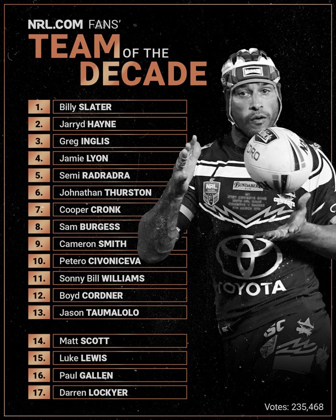 The experts delivered their verdict, now NRL fans' votes on who they think should be in the Team of the Decade have been tallied and their final 17 differs significantly from the legends line-up.