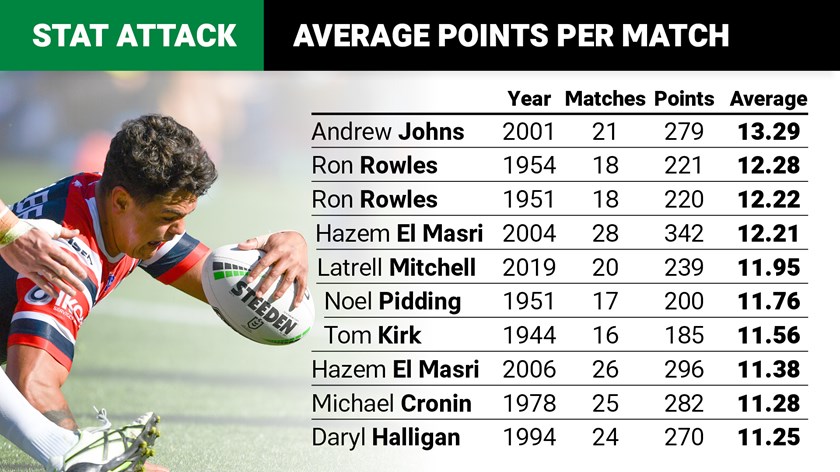 Brown averaged 16.6 points per match in 15 games for Eastern Suburbs in 1935 – a feat that is unlikely to be surpassed but there is still a chance this season that Mitchell could overtake El Masri, Rowles and Johns.