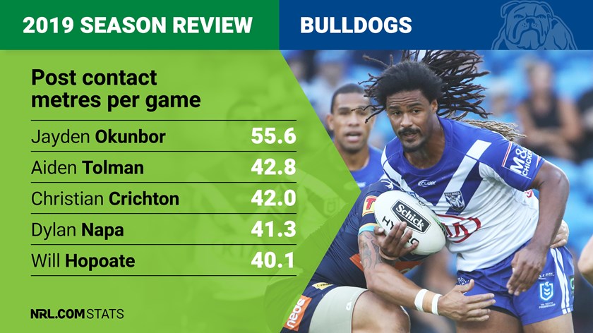 In unhappy news, the Bulldogs conceded the most post-contact metres of any side in 2019 with 512m on average.