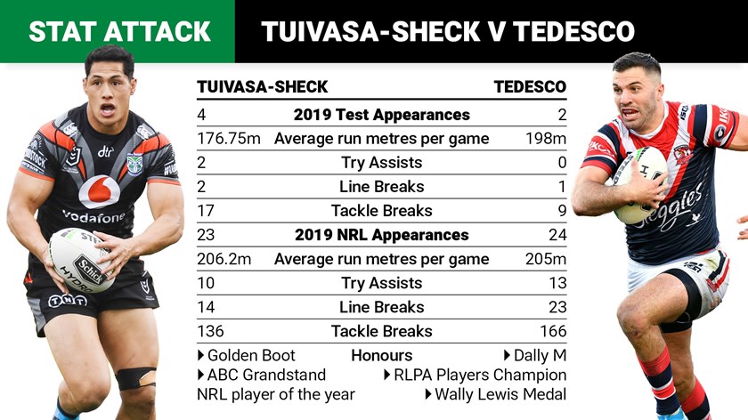 Statistics barely separated the pair, with Tuivasa-Sheck and Tedesco ranking No.1 and No.2 in the NRL for running metres and tackle breaks.