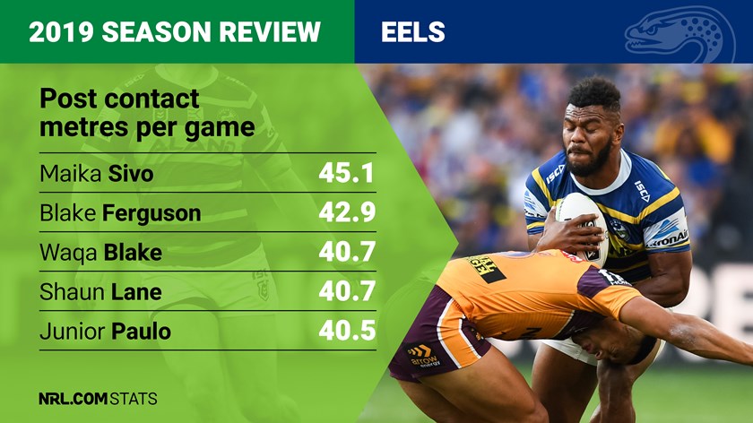 In this category the Eels were middling at best; no Parramatta players figured in the NRL top 10 for most PCM per carry or per game with Maika Sivo's 45.1m per game and Waqa Blake's 3.56m per carry the club's best.