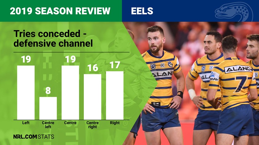 The Eels' left flank and middle channel were almost as busy in defence as attack, conceding the bulk of the Blue & Golds' tries with 19 apiece.