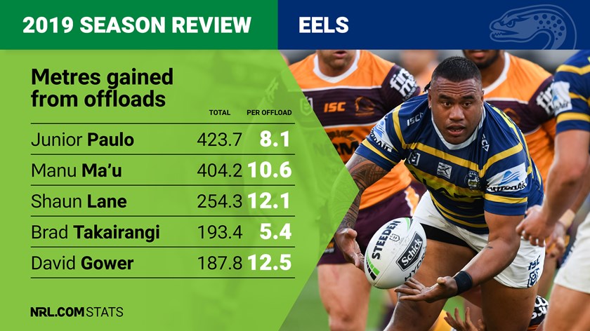 Skipper Clint Gutherson in support was easily the main benefactor, gaining 426 metres across the season from receiving offloads while unsurprisingly it was the likes of Junior Paulo (423 metres for the season), Manu Ma'u (404m) and Shaun Lane (254m) throwing the offloads that caused the damage.