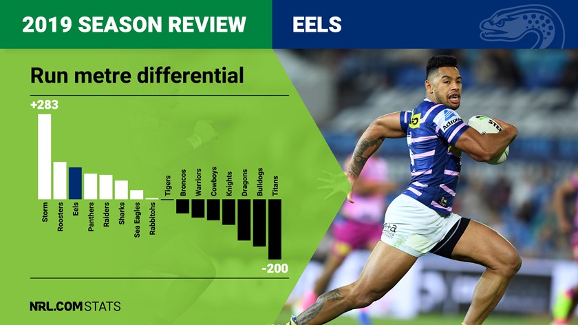 As discussed above the Eels weren't dominant in terms of post-contact metres but their total metres figure was excellent, trailing just the year's two standout teams, the Storm and Roosters. Their metres conceded per game was also comfortably inside the top half of the competition, giving them a net result better than any side other than the above-mentioned powerhouses.