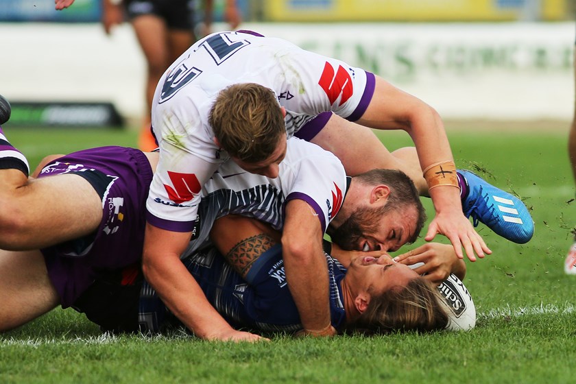The hosts made a horror start to the second quarter, coughing up possession on the very first play after a ratting hit from Faasuamaleaui, which Melbourne turned into points via a Sandor Earl try down the left flank.