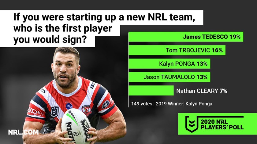 The best fullback and player in the game is also the most sought after, with James Tedesco voted as the player they would sign first if they were starting up a new club. Kalyn Ponga won this category last year but has slipped to third behind Manly’s Tom Trbojevic. David Fifita didn't make the top five, despite the Titans offering him in excess of $1 million to leave the Broncos.