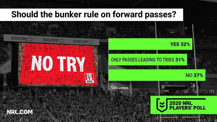 The majority of players want the bunker used for forward passes in some capacity, with 63 per cent of players calling for the introduction of technology on passes. Of the 94 players who voted in favour of video technology, 46 believe it should only be used to rule on forward passes leading to tries.