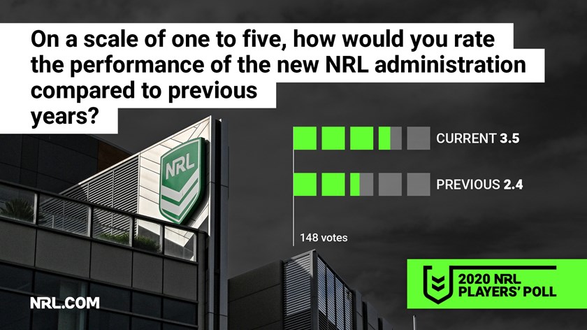 After a tumultuous few months, the NRL has come out of it looking great in the eyes of the players. The effort of the current administration to get the game back up and running following the COVID-19 break hasn't gone unnoticed, with the Peter V'landys and Andrew Abdo-led office receiving a 3.5-out-of-five mark. The NRL wasn't given a pass mark last year.