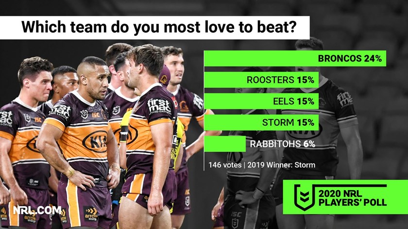 It appears the players are happy to kick the Broncos while they are down, voting Brisbane as the team they most love to beat. The Broncos finished third last year behind the Roosters and Storm, but have climbed to the top of the ladder. The Eels' winning ways are also getting on the nerves of rivals.