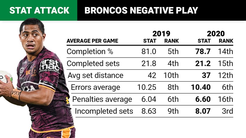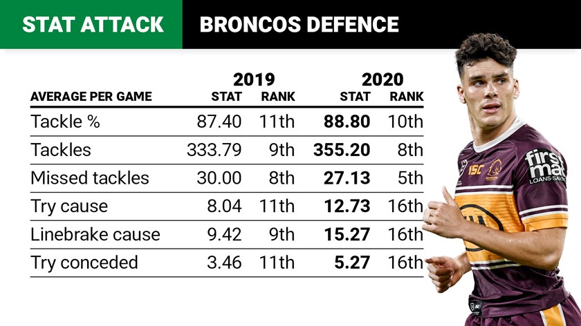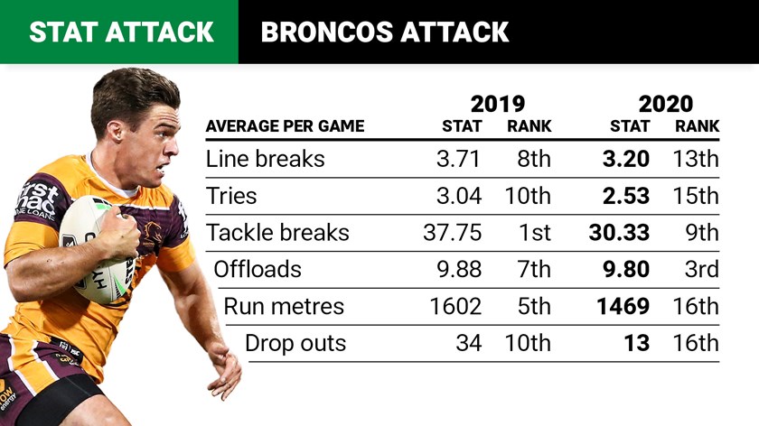 Other than the alarming drop-off in metres gained, the Broncos have dropped from the best tackle-busting club in 2019 to ninth. They were only the 10th-best club at forcing line drop-outs last season but have been the worst team in 2020.