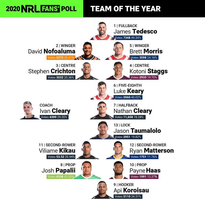 The NRL.com 2020 Fans' Poll, held in conjunction with The Daily Telegraph and Courier Mail, named Nathan Cleary a clear winner as the best player in the Telstra Premiership with 47% of the vote.