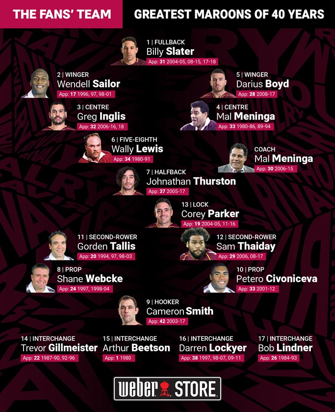 Immortal Mal Meninga was chosen in the centres for Queensland alongside Greg Inglis and was also named the Maroons' greatest coach after overseeing their golden era of successive series wins from 2006-13.