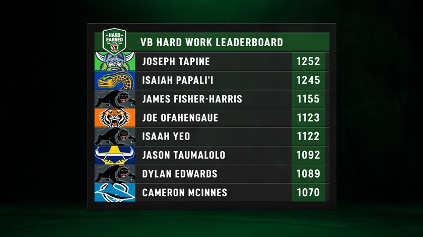 Overall, Raiders forward Joseph Tapine continued his lead on top of the VB Hard Earned Index leaderboard with the ninth-highest score of the round (81) taking him ever-so-slightly further ahead of Eels forward Isaiah Papali'i.